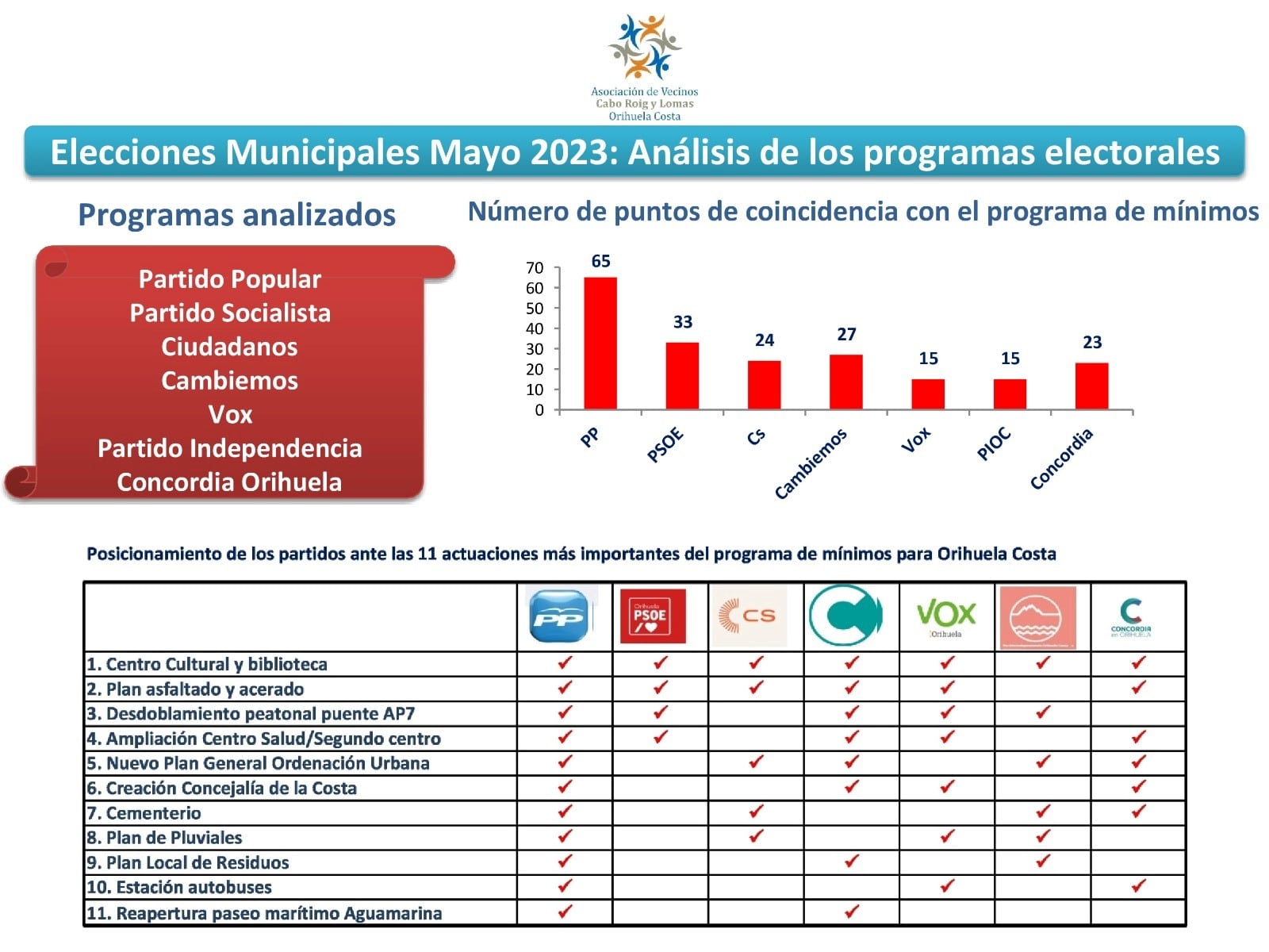 The other interesting statistical news is the publication of an analysis of party positions of interest to Orihuela Costa carried out by the most important neighbourhood association in Orihuela Costa, Vecinos de Cabo Roig and Lomas.