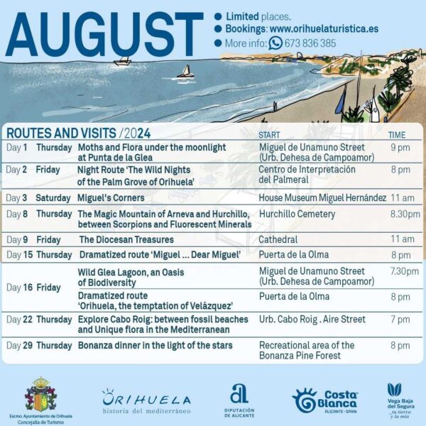 “On the August routes, visitors will be able to enjoy the Orihuela coast, as well as the cultural and historical nights and routes,” concluded the Councillor for Tourism. The routes will be opened weekly. More information on the website www.orihuelaturistica.es or on WhatsApp 673 836 385.