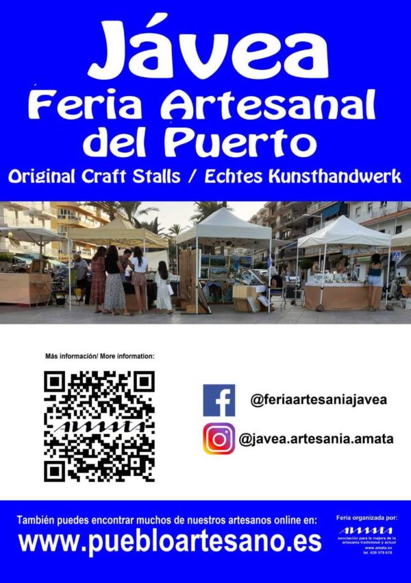 You’ll find the fair sea side promenade in the Port of Jávea (indicated on Google Maps: search for “Jávea Craft Fair”). Any changes to the programme (for example, due to bad weather) will be announced on the Amigos de Amata Instagram and Facebook pages. You can find photos of the stalls expected the following weekend at https://www.puebloartesano.es/javea.