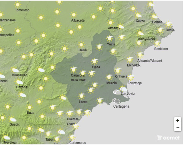Monday is expected to be a wet and unsettled day across the region. While the storm will be less intense than on Sunday, steady and occasionally heavy rain will continue, especially along the coast. Rain will spread across the entire region during the morning, with yellow warnings remaining in place for Campo de Cartagena and Mazarrón until 10am.