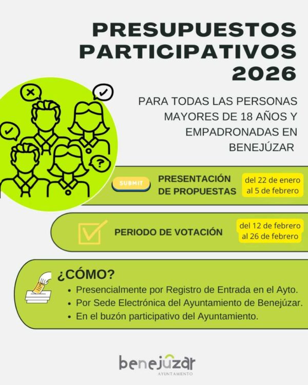 Benejúzar, January 22, 2026 – The Benejúzar City Council has officially opened the 2026 Participatory Budget process, inviting residents to propose projects and initiatives that could improve the municipality. All residents over 18 years old and registered in the town can submit their proposals between January 22 and February 5.