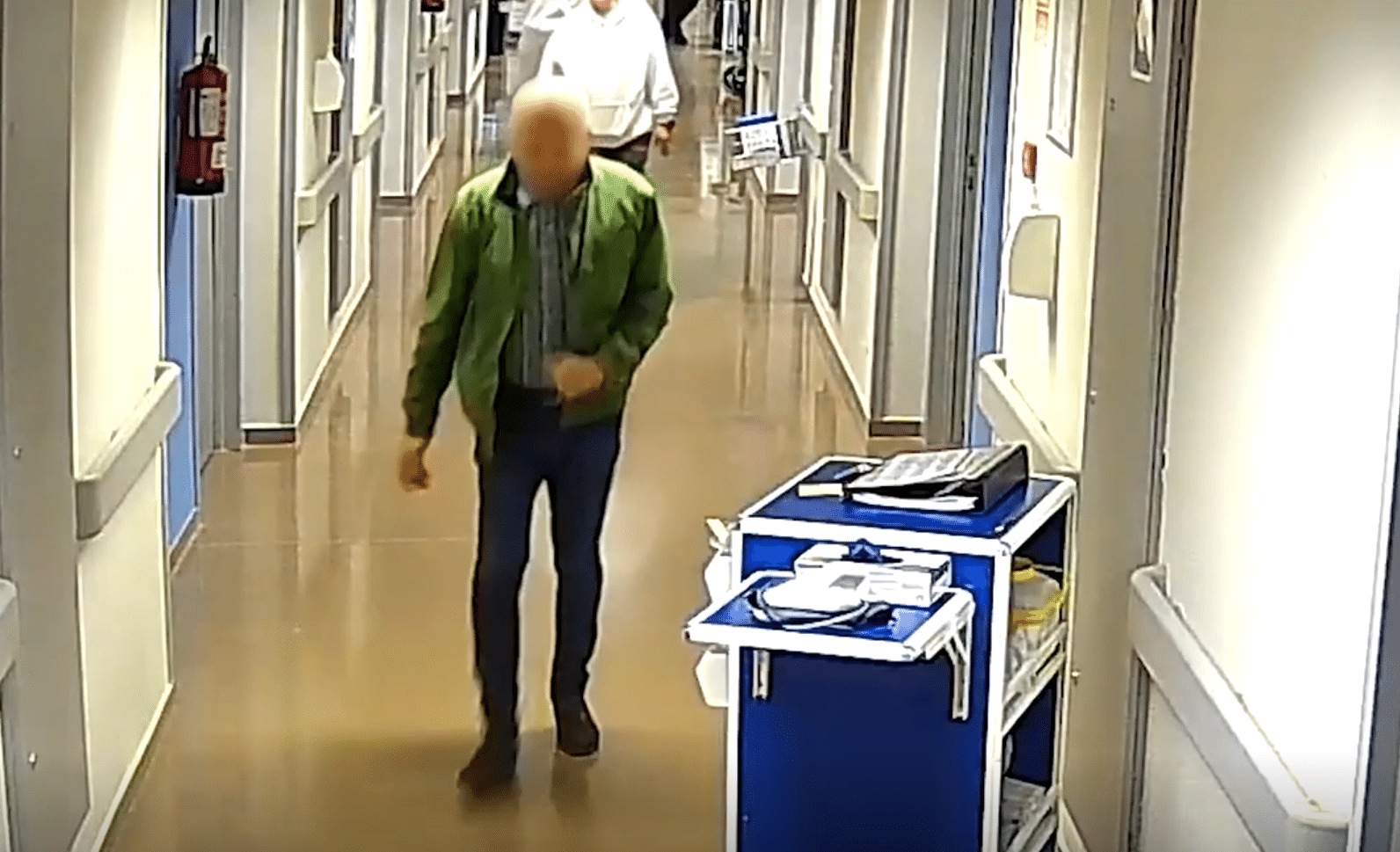 The images showed a man moving through the wards with part of his face hidden by a peaked cap, appearing to chat on the phone while selecting potential victims. Once inside a room, he allegedly concealed the stolen items in his jacket before leaving.