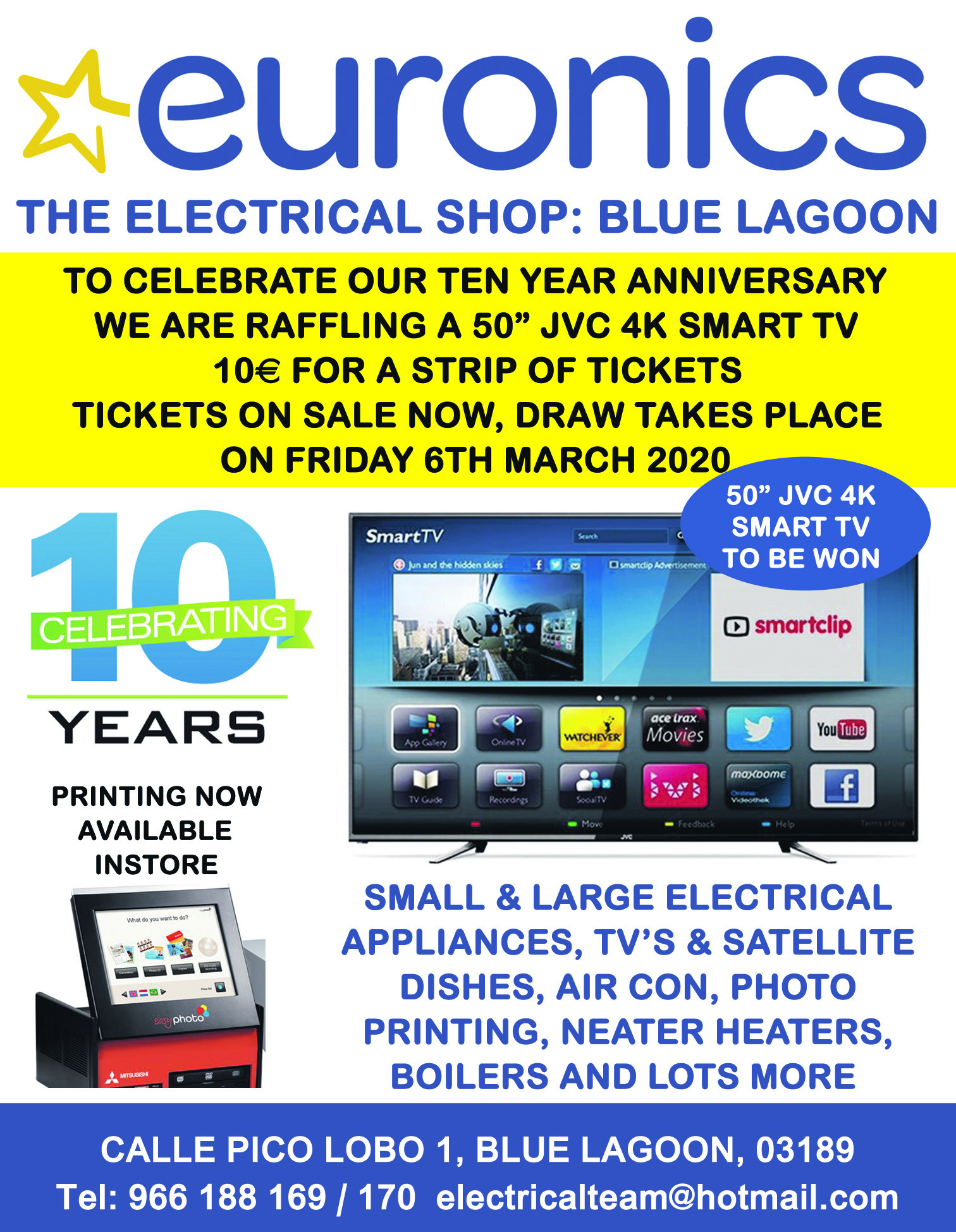 Coming up this March, is the Euronics showroom 10th anniversary and to commemorate the occasion a 50 inch J.V.C. 4k tv is up for grabs. Pop into the showroom for details.